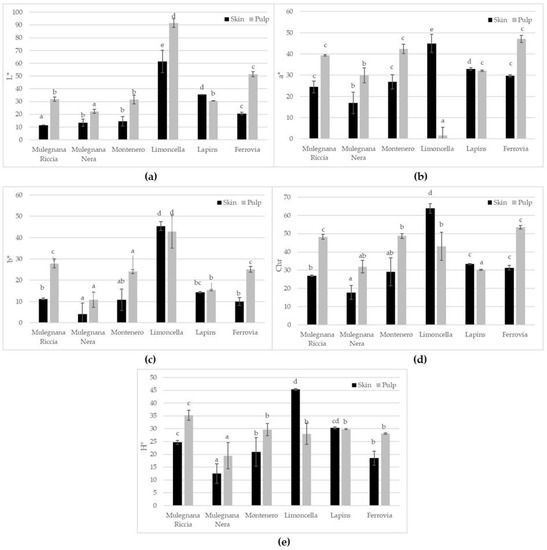 Lightness (a), a* (b), b* (c), chroma (d) and hue angle (e) of skin e pulp in the four sweet cherry accessions (Mulegnana Riccia, Mulegnana Nera, Montenero and Limoncella) compared to two standard cultivars (Lapins and Ferrovia). Data represent means ± SD. The same letters indicate non-significant differences (Tukey test) between accessions/cultivars.
