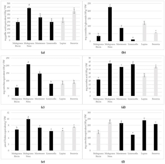 Total polyphenols (a), anthocyanins (b), flavonoids (c), ascorbic acid (d), antioxidant activity (e) and condensed tannin (f) in the four sweet cherry accessions (Mulegnana Riccia, Mulegnana Nera, Montenero and Limoncella) compared to two standard cultivars (Lapins and Ferrovia). Data represent means ± SD. The same letters indicate non-significant differences (Tukey test) between accessions/cultivars.