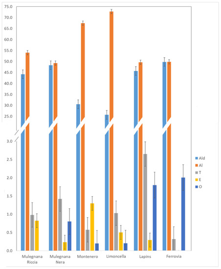 Distribution of the VOCs identified in each investigated sweet cherry genotype by chemical family (Mulegnana Riccia, Mulegnana Nera, Montenero and Limoncella, Lapins and Ferrovia). Ald: aldehydes; Al: alcohols; T: terpenes; E: esters; O: others.