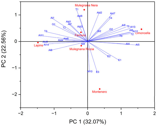 The dataset was composed of 18 observations (six biological samples as technical triplicates) and 34 VOCs and the biplot achieved by modelling the HS-SPME/GC-MS semi-quantitative data (% RPA) by PCA is shown in Figure 6. The two components PC1 and PC2 accounted for 32.07% and 22.56% of the variation in the dataset, respectively. Specifically, Limoncella was characterized by both positive PC1 and PC2, while Lapins and Mulegnana Riccia displayed negative PC1 and PC2. Moreover, Mulegnana Nera and Ferrovia presented negative PC1 and positive PC2 compared to Montenero that displayed positive PC1 and negative PC2 (Figure 6). From the biplot, it can be deduced which vectors contributed to the position of the score plots of the accessions and cultivars in the graph. In particular, the Al3 vector determined the placement of the Mulegnana Riccia score plot because it is a cultivar-dependent volatile organic compound, i.e., only present in this accessions. The vectors related to the aldehydes cis-3-hexenal (Ald2), benzaldehyde (Ald7), and dodecanal (Ald8) and the terpenes limonene (T1) and linalool (T4) were most closely related to Mulegnana Nera. Trans-2-hexenyl butyrate (E3) is also a cultivar-dependent volatile organic compound, and together with the Al10 vector, oriented the position in the graph of the Montenero accession. The position of Limoncella was determined by the vector relating to VOCs Al5, Al8, T5, T6, T2, and Al13, which, as shown in the table below, are those most prominent in the accession. Decanal (Ald6), 1-octen-3-ol (Al9), and phenol (Al14) are cultivar-dependent VOCs, and they determined the position in the biplot of the Lapins cultivar. The volatile organic compounds most commonly present in the cultivar Ferrovia were hexanal (Ald1), 2-hexenal (Ald3) and geraniol (T7), the vectors of which determined the score plot position in the PCA.