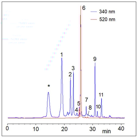 Representative HPLC chromatograms of a sweet cherry (poly)phenol extract monitored at 340 (blue line) and 520 nm (red line). Peaks labelled in the figure are assigned from Table 3. * caffeic acid dimer not quantified.