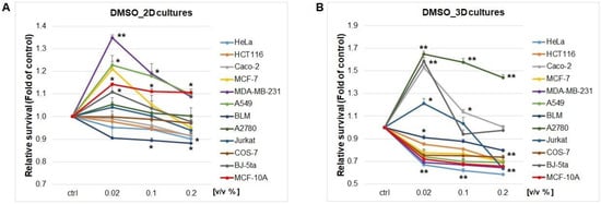 Metabolic activity influence (72 h) by DMSO vehicle in 2D (A) and 3D spheroid (B) cultures of various cancer and non-cancerous cell lines. Significance: * p < 0.05, ** p < 0.01 vs. untreated cells.