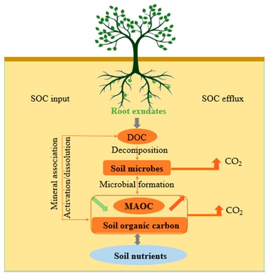 The soil carbon stock is more than twice the atmosphere carbon stock and plays a critical role in the global carbon (C) cycle [1]. Soil can sequester and store organic carbon, thereby reducing the amount of carbon in the atmosphere, and thus mitigating climate change. However, one concern is that the mineralization of soil organic carbon increases atmospheric CO2 concentrations. Soil is a non-homogeneous system, and the temporal scales of different forms of soil carbon turnover considerably vary under the influences of climate change, soil physicochemical properties, land management, and other factors. Due to the limits in monitoring, verification, sampling, and depth methods, it is also difficult to interpret and quantify a small increase or decrease in the soil carbon stock at different spatial and temporal scales and to assess the carbon sequestration potential of soil [2]. The source forms of soil carbon can be divided into directly fixed soil inorganic carbon (such as calcium and magnesium carbonate) and indirectly fixed soil organic carbon (SOC). SOC is a dynamic organic continuum. In order to better understand the underlying processes of SOC formation and mineralization, Lavallee et al. (2020) suggested that SOC should be separated into particulate organic carbon (POC) and mineral-associated organic carbon (MAOC) [3]. POC is mainly derived from litter and root inputs, while MAOC is mainly microbial derivatives [4]. MAOC usually can keep longer [3]. With the deepening of the research on the soil carbon cycle, the mechanism of SOC stabilization has been gradually revealed. Plant carbon inputs are the dominant organic constituent of SOC, and their relative importance outweighs other abiotic factors to SOC stabilization in the topsoil at regional and global scales [5]. Plant inputs enter the soil as either aboveground C or belowground C and include both structural litter inputs (e.g., root and shoot detritus) and dissolved organic carbon (DOC) (rhizodeposition and leaf litter leachate). A suite of recent studies has found that belowground carbon inputs have a greater impact on the efficiency and stabilization of soil carbon inputs than aboveground carbon inputs do [6,7,8]. Belowground carbon inputs retained in the mineral soil are between two and five times more efficient than aboveground carbon inputs at a certain spatial and temporal scale [9]. Plant roots are the key structure connecting the aboveground and belowground parts of plants, and their morphological structure, physiological metabolism, and other characteristics affect the carbon allocation from plants to soil.