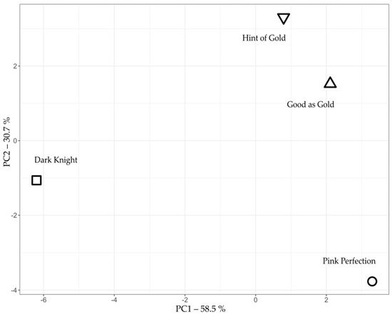 As the plants are cultivars from Caryopteris x clandonensis a common base profile (e.g., caryophyllene, perillyl alcohol, sabinene, farnesene or campholenal) of volatiles was expected, see Table S1, as has been shown for other plants and their cultivars [35,36]. In this study, distinct differences between Dark Knight, Good as Gold, Hint of Gold, as well as Pink Perfection, can be shown.