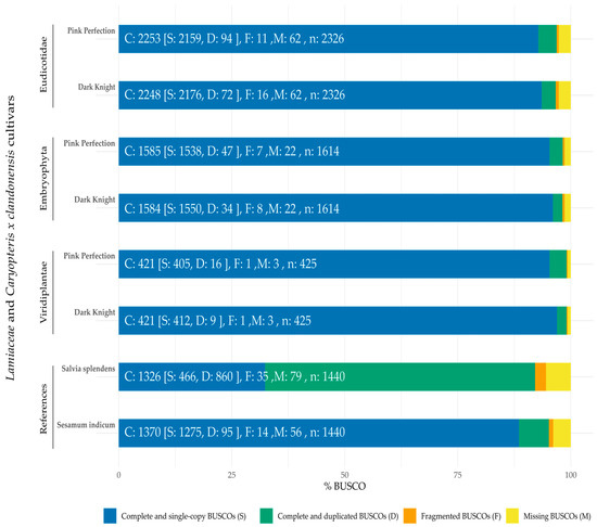 To assess the genome completeness and reliability of both genome sequences, a Benchmarking Universal Single-Copy Orthologs (BUSCO) analysis was performed (see Figure 2). Both genomes were compared to the kingdom Viridiplantae and the clades Embrophyta and Eudicotidae, respectively. The selection of these lineages was based on the increasing grade of affiliation and the different accompanying BUSCO gene sets (in former order). For closer clades, more concise sequences are necessary in order to be identified as complete. In our case, even more affiliated clades show less deviation of completeness than expected in comparison to Viridiplantae. As the genomes were compared to different BUSCO datasets, the obtained results were depicted after normalization in Figure 2 to enable a concise comparison. Assessed genome completeness from the closest related clade (Eudicotidae) was 96.6% for Dark Knight and 96.8% for Pink Perfection, which were also compared to reference genomes of Salvia splendens (92.1%) [37] and Sesamum indicum (95.1%) [38]. The latter were only compared with the Viridiplantae database with BUSCO v2.0.1 and v3.0, whereas our data were analyzed by BUSCO v5.3.2. This may have caused the difference between 425 and 1440 BUSCO datasets, as frequent updates of the gene sets are necessary to improve BUSCO analysis [39]. The reference genomes were chosen due to the high prevalence in BLAST searches [40,41] using Caryopteris x clandonensis sequences. S. splendens appears to harbor mostly complete and duplicated BUSCOs, whereas S. indicum shows comparable results to the new genomes of Pink Perfection and Dark Knight with a majority of complete and single-copy BUSCOs. To interpret BUSCO results, it is necessary to understand duplicated BUSCOs and their nature, as these can be of biological or technical origin. In eukaryotic genomes, divergences in haplotypes often lead assemblers to form duplicates of high heterozygosity regions, resulting in contiguity issues and obstacles in further evaluation steps, such as gene annotation [42,43]. To circumvent these issues, tools such as “purge_dups” are utilized to remove duplicate regions (haplotigs) from the assembly to assure genome contiguity [42]. A consecutive polishing of obtained contigs and haplotigs using phasing results in increased genome quality. Of the newly assembled genomes only 0.24–0.69%/0.71–2.67% are fragmented or missing, respectively. The absence of some BUSCO genes may be due to a loss of true genes or these may be existing as true gene duplications [43].