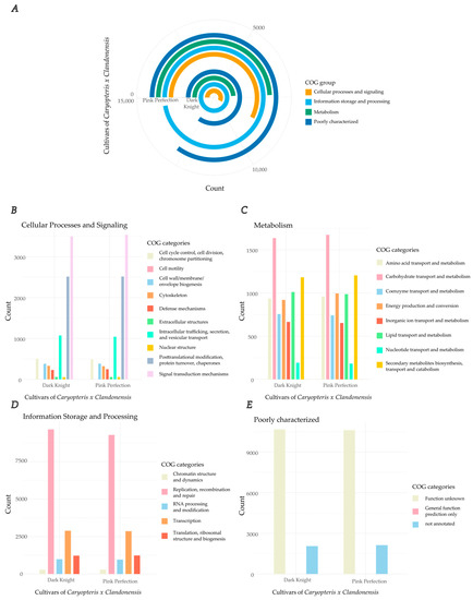 Annotation of gene sets for Cluster of Orthologous Groups (COG) for both cultivars, Dark Knight and Pink Perfection. (A) COG of two different cultivars of Caryopteris x clandonensis, Pink Perfection (outer ring) and Dark Knight (inner ring). Groups are divided in cellular processes and signaling, information storage and processing, metabolism, and a category for poorly characterized gene sets. (B) COG of cellular processes and signaling associated genes, total counts. (C) COG of metabolism-associated genes, total counts. (D) COG of information storage and processing associated genes, total counts. (E) COG of poorly characterized genes, total counts.