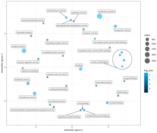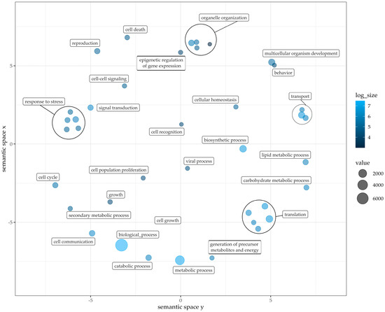 In Figure 4, GO terms related to biological processes are depicted with their respective prevalence (dot size). In addition, some clusters with similar functions were grouped by circles into the main function of these GO terms, as can be seen, e.g., with “translation” in the bottom right corner. Incorporated into this cluster are the terms: protein modification process, DNA metabolic process, nucleobase-containing compound metabolic process, and protein metabolic process. The cluster organelle organization includes cytoskeleton organization, cytoplasm organization, and mitochondrion organization. Clustered with transport: ion transport, protein transport. The last cluster response to stress contains the GO terms response to a biotic stimulus, response to an abiotic stimulus, response to an external stimulus, and response to an endogenous stimulus. GO terms without clustering but still strongly prevalent in the PCA are biological, metabolic and biosynthetic processes.