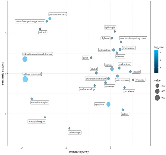 Gene Ontology term classification within cellular components of Pink Perfection. Figure was drafted employing REVIGO [59] and customized with R. Value and log size represent the counted GO terms across annotated gene models.