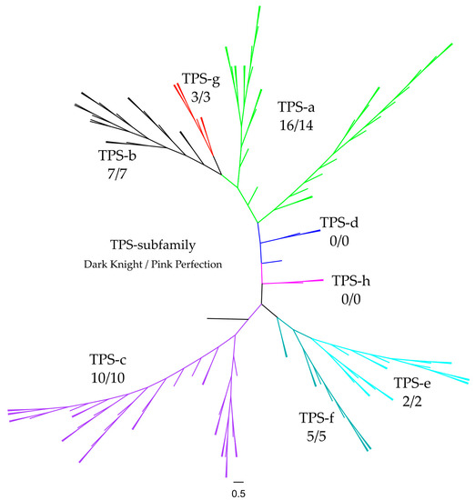 To investigate the similarity and the affiliation into TPS subfamilies regarding identified TPS, a phylogenetic tree was constructed. Analysis was based on multiple sequence alignment by Clustal Omega using default parameters (see Figure 7). To differentiate between TPS families, 55 selected sequences of representative plant species were utilized as anchor sequences along with putative TPS from Dark Knight and Pink Perfection; the root was Physcomitrella patens (adapted from [66]). The multicolored clades belong to the different TPS subfamilies and are used as references, for a more detailed overview see the supplemental lamiaceae reference. Concise numbers of TPS subfamily distribution in both cultivars are shown in Table 4. The most prominent subfamilies are TPS-a (green), TPS-b (black) and TPS-c (purple), which is in line with the distribution in Eudicots, Angiosperms and land plants [67]. The subfamilies TPS-d and TPS-h are not present in the investigated cultivars. These findings are supported by the literature, as TPS-d clusters are derived from Gymnosperm species [63,68] and TPS-h are specific for Selaginella moellendorffii [67].