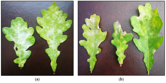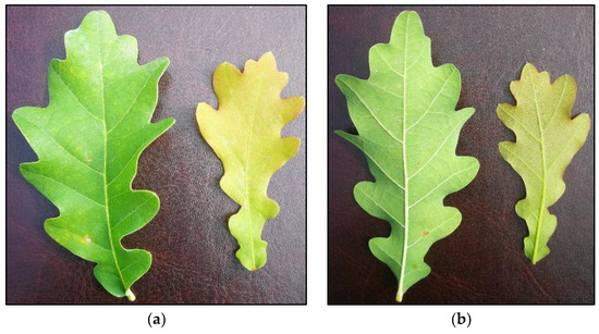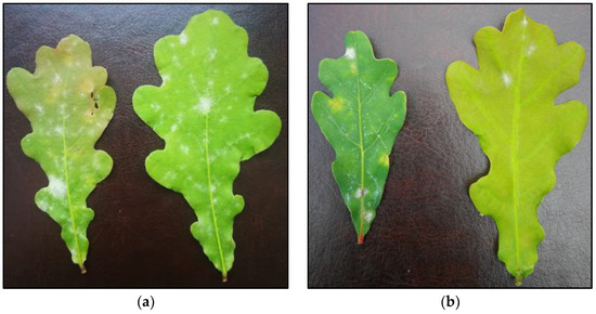 Oak leaves (mature—Left; juvenile—Right) with no symptoms of powdery mildew after 69 days of fungal inoculation and five treatments with BTHWA: (a) upper side; (b) bottom side.