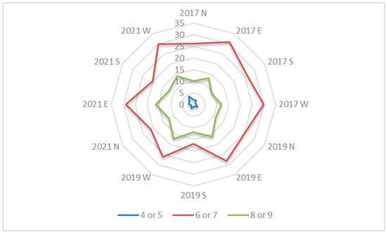 Species assignment according to their light preference using Ellenberg’s indicator values and their distribution in the segments of the vertical green columns in different expositions (north, east, west, and south) in the study years 2017–2022. Ellenberg’s indicator values: 3—shade plants, mostly less than 5% illumination; 4—between 3 and 5; 5—semi-shade plants, rarely in full light, but generally with more than 10% relative illumination; 6—between 5 and 7; 7—plants generally in well-lit places, but also occurring in partial shade, and not found in less than 30% relative illumination; 8—light-loving plants found in relative illumination in summer no less than 40%; and 9—plants in full light, found mostly in full sun, and with illumination in summer no less than 50%.