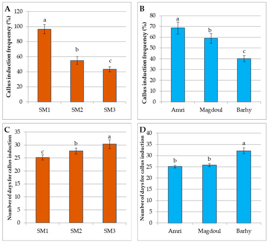 (A). The percentages of callus induction frequency in the three varieties (Amri, Magdoul and Barhy). (B). The percentages of callus induction frequency of the three starting media (SM1, SM2 and SM3). (C). The number of days for callus induction on the three starting media (SM1, SM2 and SM3). (D). The number of days for callus induction in the three varieties (Amri, Magdoul and Barhy. Note: Charts with the same letters are not statistically different at p < 0.05. Different letters denote a significant difference among culture media at p < 0.05.