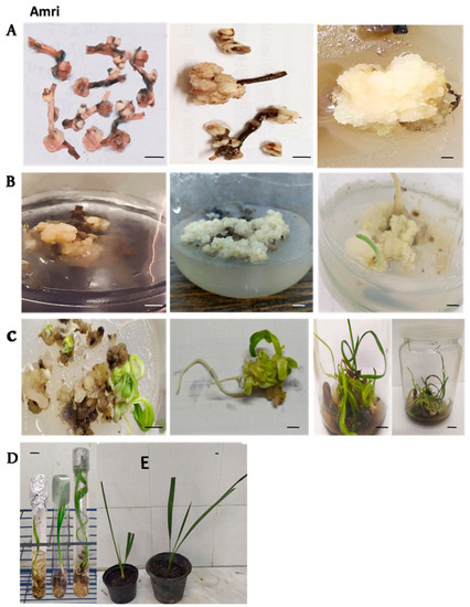 Date palm micropropagation by immature female inflorescences in Amri variety (A). Various structures of callus formation and development on starting media after the first subculture, the second subculture and the third subculture, respectively (from left to right). (B). Matured embryogenic calli and development of somatic embryogenesis under darkness after 8 weeks, 12 weeks and 16 weeks, respectively (from left to right). (C). Germinated somatic embryos and shoot multiplication after 4 weeks, 6 weeks and 12 weeks, respectively (from left to right). (D). Shoot rooting. (E). Acclimatized plantlets. Scale bar: 1 cm.
