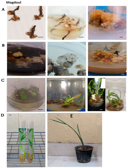 Date palm micropropagation by immature female inflorescences in Magdoul variety. (A). Various structures of callus formation and development on starting media after the first subculture, the second subculture and the third subculture, respectively (from left to right). (B). Matured embryogenic calli and development of somatic embryogenesis under darkness after 8 weeks, 12 weeks and 16 weeks, respectively (from left to right). (C). Germinated somatic embryos and shoot multiplication after 4 weeks, 6 weeks and 12 weeks, respectively (from left to right). (D). Shoot rooting. (E). Acclimatized plantlets. Scale bar: 1 cm.