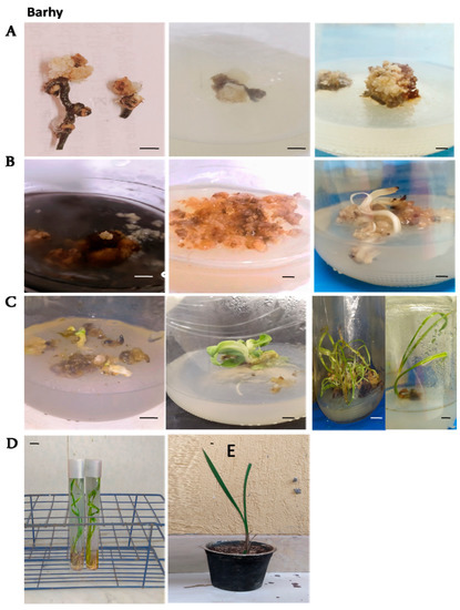 Date palm micropropagation by immature female inflorescences in Barhy variety. (A). Various structures of callus formation and development on starting media after the first subculture, the second subculture and the third subculture, respectively (from left to right). (B). Matured embryogenic calli and development of somatic embryogenesis under darkness after 8 weeks, 12 weeks and 16 weeks, respectively (from left to right). (C). Germinated somatic embryos and shoot multiplication after 4 weeks, 6 weeks and 12 weeks, respectively (from left to right). (D). Shoot rooting. (E). Acclimatized plantlets. Scale bar: 1 cm.