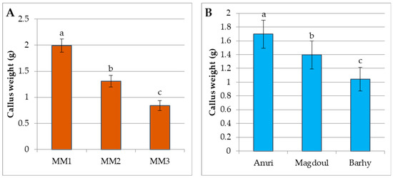 (A). The callus weights of the three maturation media (MM1, MM2 and MM3). (B). The callus weights of the three varieties (Amri, Magdoul and Barhy). Note: Charts with the same letter are not statistically different at p < 0.05. Different letters denote a significant difference among culture media at p < 0.05.