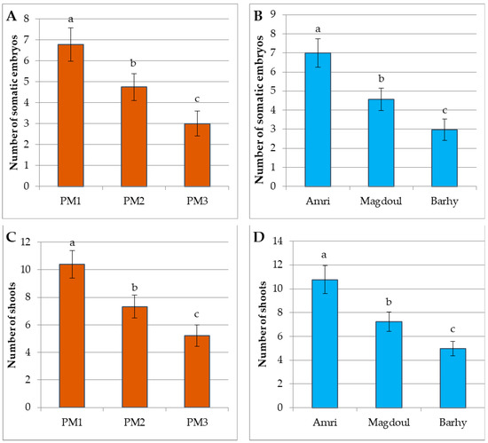 Responses of Amri, Magdoul and Barhy varieties in the multiplication stage. (A). Number of somatic embryos of the three multiplication media (PM1, PM2 and PM3). (B). Number of somatic embryos of the three varieties (Amri, Magdoul and Barhy). (C). The number of shoots of the three multiplication media (PM1, PM2 and PM3). (D). The number of shoots of the three varieties (Amri, Magdoul and Barhy). Note: Charts with the same letter are not statistically different at p < 0.05. Different letters denote a significant difference among culture media at p < 0.05.