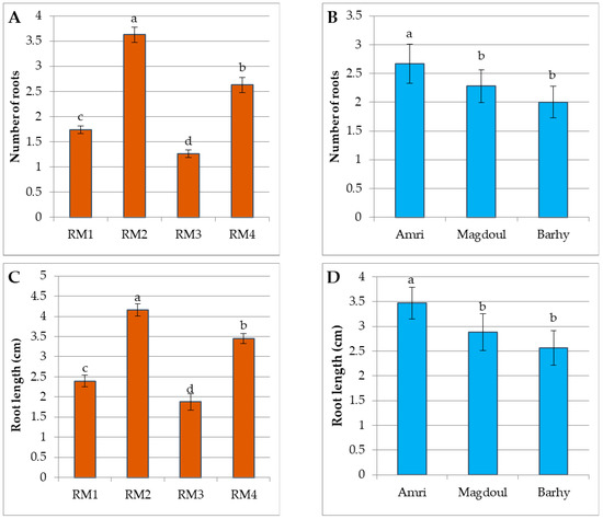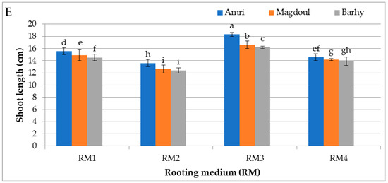 (A). Roots numbers of the four rooting media (RM1, RM2, RM3 and RM4). (B). Roots numbers of the three varieties (Amri, Magdoul and Barhy). (C). The root length of the four rooting media (RM1, RM2, RM3 and RM4). (D). The root length of the three varieties (Amri, Magdoul and Barhy). (E). The shoot length of the three varieties (Amri, Magdoul and Barhy) on the four rooting media (RM1, RM2, RM3 and RM4). Note: Charts with the same letter are not statistically different at p < 0.05. Different letters denote a significant difference among culture media at p < 0.05.