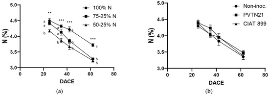 Total-N content in the aboveground biomass (shoots) of common-bean (Phaseolus vulgaris L.) plants during vegetative-, flowering-, just-prior-to-pod-formation, and reproductive-growth stages (25, 35, 42, and 62 DACE, respectively). The graphs show: (a) the impact of different mineral-N treatments; and (b) inoculation with rhizobia. *** and ** denotes statistical significance according to Duncan’s multiple range test at p < 0.001 and p < 0.01, respectively.