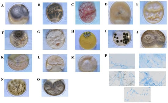The morphology of various endophytic fungal colonies after incubation at 25 °C for 7 days: (A) Cladosporium sp. colony morphology showed brown or black colonies with dark-pigmented conidia; (B) Phoma sp. colony morphology showed brown chlamydospores that are arranged singly or in chains; (C) Pestalotiopsis oryzae colony morphology showed brown or dark brownish colonies with slimy conidial masses protruding from the surface; (D) Mucor fragilis colony morphology showed fluffy, white to dark-grey colonies with the development of sporangia; (E) Botrytis cinerea colony morphology showed whitish to greyish sclerotia colonies with short mycelium without sporulation; (F) Phomopsis sp. colony morphology showed white to brown hyphae and black fruiting bodies; (G) Colletotrichum gloeosporioides colony morphology showed white, fluffy, dense, light grey colonies with masses of conidia; (H) Trametes versicolor colony morphology shows whitish to light brown colonies with leathery texture; (I) Fusarium graminearum colony morphology showed pale or bright-colonies with a cottony aerial mycelium; (J) Xylariaceae sp. colony morphology showed yellow to brown colonies with scanty aerial mycelium; (K) Diaporthe phaseolorum colony morphology showed a white, lanose colony; (L) Didymella sp. colony morphology showed fluffy, whitish, grey colonies with aerial mycelia; (M) Fusarium oxysporum colony morphology showed whitish colonies with short conidia; (N) Aspergillus flavus colony morphology showed powdery masses of yellowish-green spores with cottony texture on the upper surface; (O) Alternaria alternata colony morphology showed green to olive-green colonies with small conidia; (P) Optical microscopy of mycelia of some endophytic fungi from Ageratina adenophora after incubation at 25 °C for 7 days.