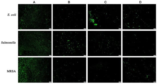 Effects of ethyl acetate extracts from the endophytic fungi on the cell membrane integrity of E. coli, Salmonella, and MRSA by fluorescence microscope. (A) Untreated bacterial cells; (B) bacterial cells treated with P. sclerotigenum extracts at 2MIC; (C) bacterial cells treated with D. kochmanii extracts at 2MIC; (D) bacterial cells treated with P. trachycarpicola extracts at 2MIC. The scale bar was 200 µm.