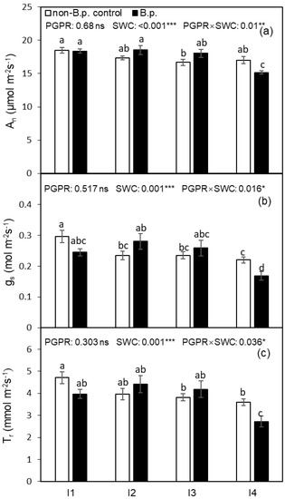 The leaf gas exchange rates, including An, gs, and Tr, were not affected by Bacillus pumilus (B.p.) inoculation before the onset of the irrigation treatment (Table 1) but were significantly affected by the soil water content (SWC) and the PGPR × SWC interaction (Figure 1) after starting the irrigation regimes. Compared to plants free from B.p. inoculation (non-B.p. control), B.p. treated plants showed greater reductions in An, gs and, Tr under I4 (20%, v/v). Compared to I1 (35%, v/v) treatment, the An, gs and, Tr of I4 plants decreased by 12.8%, 28.3%, and 27.4%, respectively, showing the gs and Tr were more sensitive to the water deficit than An.