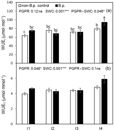 The intrinsic water use efficiency (WUEi) was significantly affected by SWC and PGPR × SWC interaction (Figure 2a). The effect of PGPR on WUEi was not significant under I1 (35%, v/v), I2 (30%, v/v), and I3 (25%, v/v), while under I4 (20%, v/v), WUEi was significantly improved by B.p. inoculation. The instantaneous water use efficiency (WUET) was significantly affected by PGPR and SWC (Figure 2b). B.p. inoculation significantly improved WUET. Regardless of PGPR inoculation, plants grown under I4 possessed higher WUEi and WUET compared to those grown under I1.