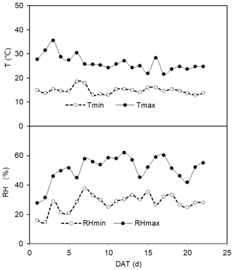 The maximum and minimum daily temperature (T, °C) and the daily maximum and minimum relative humidity (RH, %) in the greenhouse during the treatment period. Tmin and Tmax indicate the minimum and maximum daily temperature, respectively; RH min and RHmax indicate the minimum and maximum daily relative humidity, respectively.