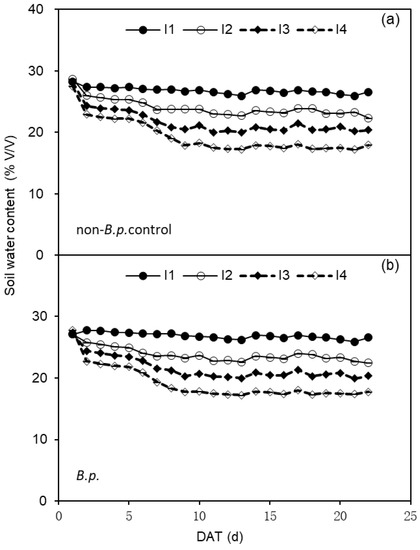 Change of soil water content (%, v/v) in the pots of tomato subjected to four irrigation regimes (I1—irrigated to 35% (v/v) SWC; I2—irrigated to 30% SWC; I3—irrigated to 25% SWC; and I4—irrigated to 20% SWC) without or with Bacillus pumilus (non-B.p. control or B.p.) inoculation. (a,b) in the figure are corresponding to SWC of non-B.p. control and B.p. plants, respectively.