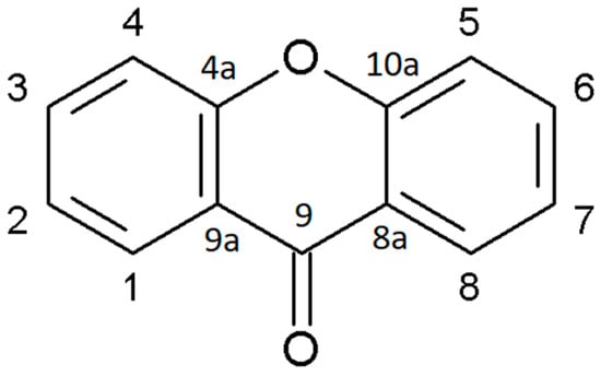 Xanthone is an aromatic oxygenated heterocyclic molecule, with a dibenzo-γ-pirone scaffold, known as 9H-xanthen-9-one, with the molecular formula of C13H8O2 (Figure 1). The number and class of rings A and B derive from the biosynthetic pathways in higher plants leading to the acetate-derived A-ring (carbons 1–4) and the shikimic acid pathway-derived B-ring (carbons 5–8). Xanthone derivatives consist of slight differences that can be found depending on the nature of the substituents and their localization on the scaffold. Different possible configurations of the two benzene rings and various substituents can be found, leading to higher complexity.