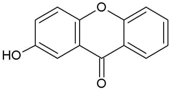 Oxygenated simple xanthones are xanthones with simple substituents such as hydroxyl or methoxy, subdivided according to the degree of oxygenation into unoxygenated, mono-, di-, tri-, tetra-, penta-, and hexaoxygenated molecules [,]. This class of xanthones is produced both by plants, but also by fungi and lichens (Table 1, Table 2 and Table 3). This group is abundant in many natural products and is the starting point for many more complex xanthones [,]. Many monooxygenated xanthones have been isolated from the Gentianaceae family, for example, 2-hydroxyxanthone (Figure 2), 4-hydroxyxanthone and 2-methoxanthone; however, these xanthones have also been found in other plant families such as Clusiaceae, Hypericaceae, Moraceae (Table 1).