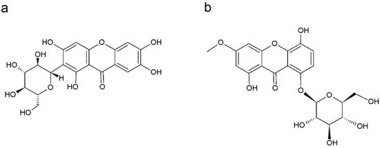 Xanthone glycosides are synthesized in higher plants and mainly found in the families Gentianaceae and Polygalaceae (Table 1). These xanthones are known to have a glycosidic residue associated with a C- or O-. Many xanthones of this group have the glycosidic residue linked to C-6 carbon and may consist of xylose, glucose, or epiose. The presence of two glycosidic residues can also be observed, the second generally being linked to the C-2 of the main structure []. Mangiferin and isomangiferin are the most common C-glycosides (Figure 3a). Mangiferin (2,-C-β-Dglucopyranosyl-1,3,6,7-tetrahydroxyxanthone) is of widespread occurrence in angiosperms and ferns and was first isolated from Mangifera indica []. Natural xanthone O-glycosides are restricted to the family Gentianaceae and in this review gentiacauloside from Gentiana acaulis L., gentioside from G. lutea, and swertianolin (Figure 3b) from Swertia japonica Makino have been reported [,,].