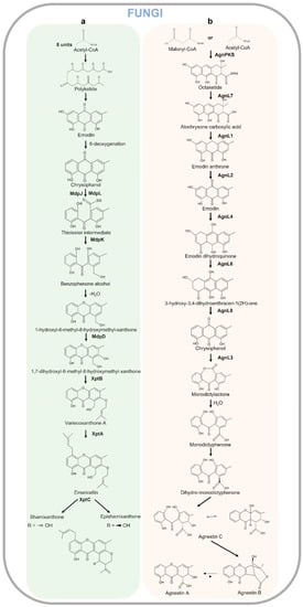 Xanthone biosynthetic pathways in fungi. Shamixanthone (a) and agnestin pathway (b).