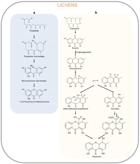 Xanthone biosynthetic pathways in lichens. Lichexanthone-type lichen xanthone (a) and thiomielin-type lichen xanthone pathway (b).
