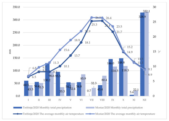 Climatic conditions (total rainfall and average air temperature) at Trebinje and Mostar localities during 2020.