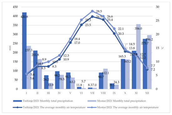 Climatic conditions (total rainfall and average air temperature) at Trebinje and Mostar localities during 2021.