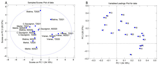 Firstly, PCA was applied on the results obtained for total phenolic content, radical scavenging activity, and the content of individual phenols. A dataset consisting of 16 objects (the number of grape samples) × 21 variables (individual polyphenols, TPC, and RSA) was processed using the covariance matrix with auto-scaling (Table S1).