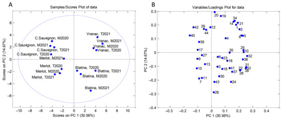 PCA analysis performed on data obtained from phenolic profiles (individual polyphenols, TPC, and RSA) of grape samples: (A) score plot and (B) loading plot (number of compounds corresponds to Table 7).