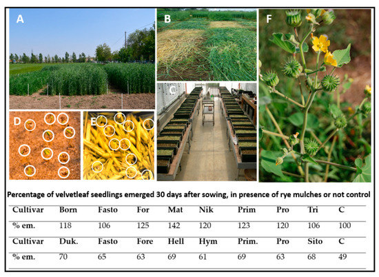 (A,B): Preparation of rye mulches at the Università Cattolica del Sacro Cuore research station in Piacenza, Italy. (C): Rye mulch covered and control planter boxes for velvetleaf germination experiments in the greenhouse. (D,E): Emergence of velvetleaf seedlings (white circles) in pots with rye mulch (E), only seedlings overtopping the rye mulch cover are circled) in comparison to the control (D). (F): Flowering velvetleaf plant in a maize field. Table—Abbreviations: % em: percentage of emerged velvetleaf seedlings; cultivars: For, Forestier; Mat, Matador; Nik, Nikita, Prim, Primizia; Pro, Protector; Tri, Treviso; Duk, Dukato; Fore, Forestal; Hell, Hellvus; Hym, Hymonta; Sito, Sito70; C: control.