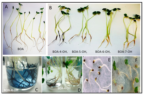 Wolf et al. described inhibitory effects of benzyl isothiocyanate from Carica papaya L. seeds on velvetleaf germination and seedling growth [57]. The C. papaya seeds contain not only the glucosinolate glucotropaeolin but also cyanogenic glycosides; in this study, the velvetleaf seeds were surface-sterilized. The inhibition of velvetleaf by benzyl isothiocyanate was also reported by Tollsten and Bergstrom [58]. In a study of Shettle and Balke [59], effects of salicylic acid, p-hydroxybenzoic acid, caffeine, hydroquinone, and umbelliferone on shoot dry-weight accumulation of several weeds and crops were investigated in a greenhouse trial. Except for hydroquinine, velvetleaf growth was only inhibited by the compounds when exposed to high amounts (56.0 kg ha−1). Exudates from roots of competitive soybean cultivars have been studied for velvetleaf suppression as well; just 20 of 280 tested cultivars were able to reduce the dry weight of velvetleaf plants and did so up to 15% [60]. Dayan et al. demonstrated negative effects of sorgoleone, an allelochemical of Sorghum bicolor (L.) Moench on velvetleaf seedling emergence and rates of photosynthetic electron transfer in leaf discs [61]; however, the seedlings were again grown from surface-sterilized seeds. Apparently, there are presently no plant-derived compounds or extracts available which have sufficient allelopathic potential to manage velvetleaf in the field, including the benzoxazinoid-derived compounds (see below) and others [62].