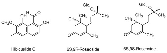 Less known secondary metabolites found in extracts of A. theophrasti: hibiscuslide C and roseosides, identified by Hwang et al. and Mamadalieva et al. [106,107].