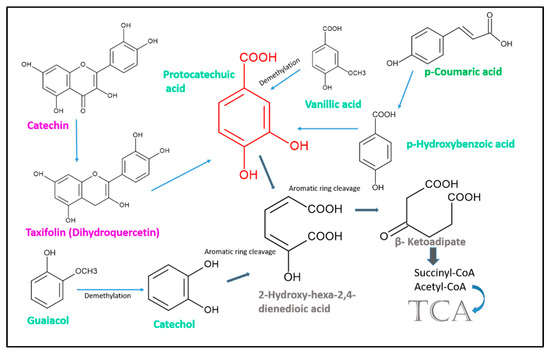 Some steps of the microbial degradation of catechin and taxifolin as members of the flavonoids (magenta), p-coumaric acid, a cinnamic acid derivative (green), and several simple phenolic compounds (petrol). Many phenolic compounds are degraded via the central intermediate protocatechuic acid, and others via catechol. Catechol and protocatechuic acid (red structure) undergo either ortho- or meta- cleavage of the aromatic ring, resulting in 2-hydroxy-hexa-2,4-dienedioic acid and β-ketoadipate. These compounds are converted to succinyl-CoA and acetyl-CoA for entering the citrate cycle (TCA).