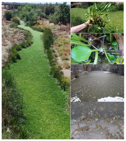 - Ministerio para la Transicion Ecológica. Estrategia de Gestión, Control y Posible Erradicación del Camalote (Eichhornia crassipes). Technical report; Ministerio para la Transicion Ecológica: Madrid, Spain, 2019. Available online: https://www.miteco.gob.es/va/biodiversidad/publicaciones/estrategiadegestioneichhorniacrassipes3deoctubre2019_tcm39-502314.pdf (accessed on 1 November 2022).