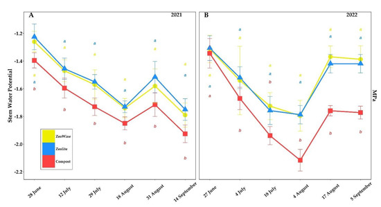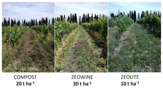 - Cataldo, E.C.; Salvi, L.S.; Paoli, F.P.; Fucile, M.F.; Masciandaro, G.M.; Manzi, D.M.; Masini, C.M.M.; Mattii, G.B.M. Effects of natural clinoptilolite on physiology, water stress, sugar, and anthocyanin content in Sanforte (Vitis vinifera L.) young vineyard. J. Agric. Sci. 2021, 159, 488–499. [Google Scholar] [CrossRef]