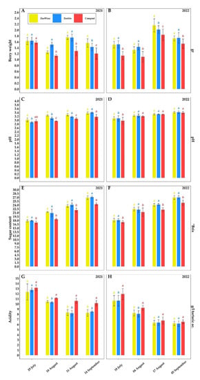 | Quercetin-3-O-glucoside | 25.47 ±4.26 b | 33.70 ±5.27 b | 47.17 ±5.18 a | 49.77 ±4.21 a | 29.85 ±4.55 b | 41.93 ±6.36 a | 48.71 ±12.73 a | 34.53 ±14.45 b | 48.31 ±15.76 a | 64.05 ±16.34 b | 55.25 ±17.28 b | 76.96 ±14.61 a | mg kg−1 |