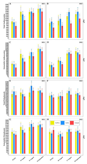 | Quercetin-3-O-galactoside | 5.75 ±3.56 a | 8.57 ±3.78 a | 12.73 ±4.56 a | 9.18 ±2.46 a | 5.80 ±3.68 a | 8.15 ±4.76 a | 8.06 ±3.45 a | 5.98 ±3.23 a | 9.46 ±2.87 a | 13.50 ±4.23 ab | 10.11 ±4.36 b | 22.04 ±4.11 a | mg kg−1 |
