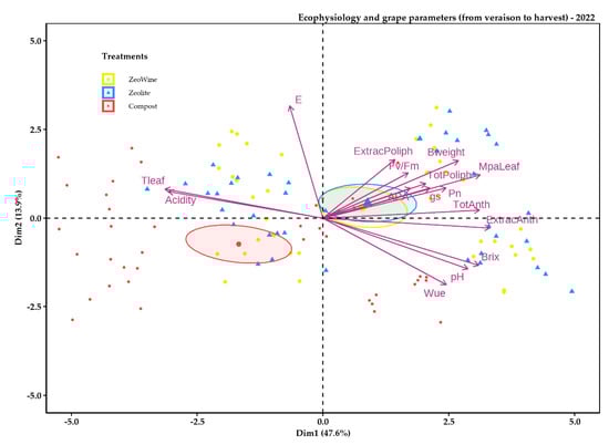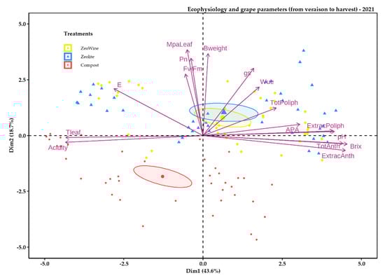 Cataldo, E.; Fucile, M.; Manzi, D.; Masini, C.M.; Doni, S.; Mattii, G.B. Sustainable Soil Management: Effects of Clinoptilolite and Organic Compost Soil Application on Eco-Physiology, Quercitin, and Hydroxylated, Methoxylated Anthocyanins on Vitis vinifera. Plants 2023, 12, 708. https://doi.org/10.3390/plants12040708