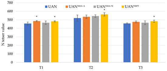 The effect of the UAN fertilizer with NHAs and NBPT on chlorophyll contents (N-tester value). The columns represent the mean (n = 12); error bars present the mean standard deviation. The mean values marked with asterisk are significantly different (p ≤ 0.05) from the treatment UAN by Tukey’s test (each of the terms was statistically evaluated separately).