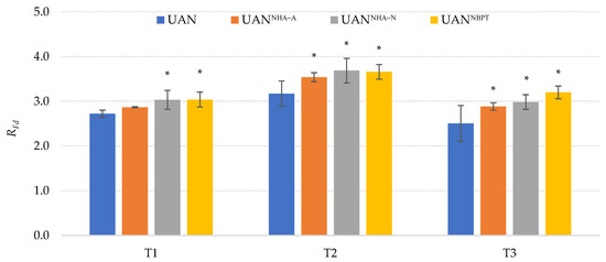 The effect of the UAN fertilizer with NHAs and NBPT on chlorophyll fluorescence decrease ratio (RFd). The columns represent the mean (n = 12); error bars present the mean standard deviation. The mean values marked with asterisk are significantly different (p ≤ 0.05) from the treatment UAN by Tukey’s test (each of the terms was statistically evaluated separately).