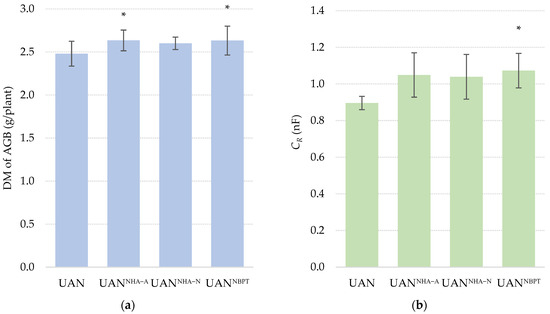 The effect of the UAN fertilizer with NHAs and NBPT on (a) weight of DM of AGB, and (b) root electrical capacitance of maize (CR). The columns represent the mean (n = 12); error bars present the mean standard deviation. The mean values marked with asterisk are significantly different (p ≤ 0.05) from the treatment UAN Tukey’s test.